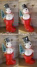 Frosty is tucked inside a very well loved and worn vintage paper mache candy container boot.
