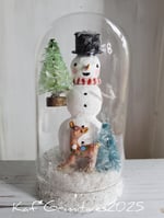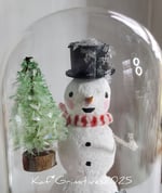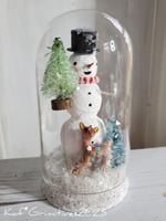 Snowman is tucked inside a glass cloche. Snowman is firmly attached to base.